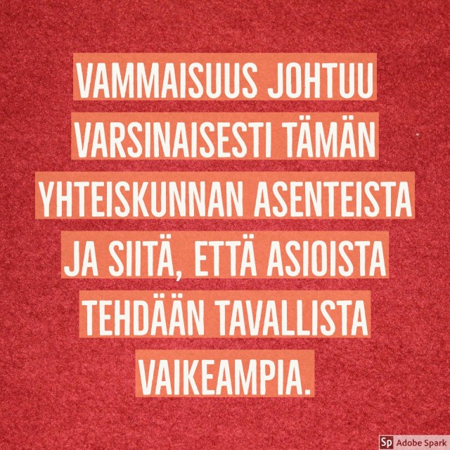 Kirjoitan tämän tekstin 6.10. maailman CP-päivän hengessä. Totta kai mua joskus ärsyttää, että koen jatkuvasti enemmän tai vähemmän kipua, tai että en osaa organisoida asioita. Olen kuitenkin oppinut elämään sen kanssa. Mulla on oikeastaan kaksi asiaa, jotka ärsyttävät minua joka sekunti. Se, että yhteiskunta tekee meistä vammaisia. Jos joku ei pysty kävelemään, se on ihan samanlainen piirre kuin se, että ihminen on punatukkainen. Vammaisuus johtuu varsinaisesti tämän yhteiskunnan asenteista ja siitä, että asioista tehdään tavallista vaikeampia. Tämä ei suinkaan ole minun oma keksintöni, vaan asian on todennut esim. vammaistutkimuksen professori Simo Vehmas.