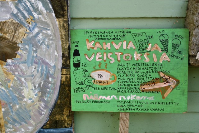 Kahvilan pihassa näkyy jo monta hauskaa teosta. Tämähän on jännää! Pihassa on myös kanoja häkissään. Lampaitakin on kuulemma ollut, mutta juuri nyt aitaus on tyhjä.