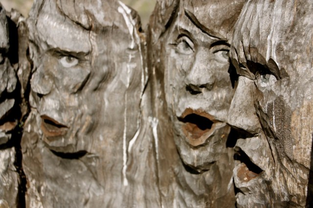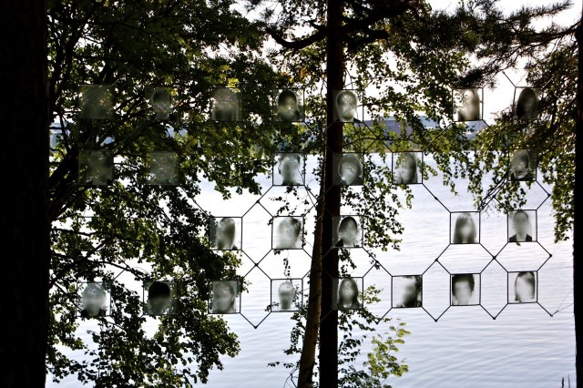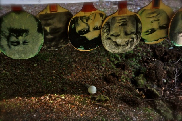Suuntaan metsään. Pian näen metsän keskellä pingispöydän. Kävelen lähemmäksi ja huomaan, että se on osa ympäristötaidenäyttelyä. Mailoissa on tunnettujen ihmisten kasvokuvia. Maassa on pallokin. Aika hauska idea! Toivon, että kukaan ei tuhoa tai varasta näitä.