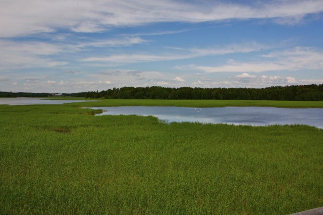 Pian päädyn lintulavalle. Täällä on todella hiljaista. Minun lisäkseni täällä on kaksi ihmistä kiikareineen. Luonnonsuojelualue vesistöineen on kansainvälisesti merkittävä lintukosteikko. Kaukana näkyykin joutsen poikueineen. Kaunista.