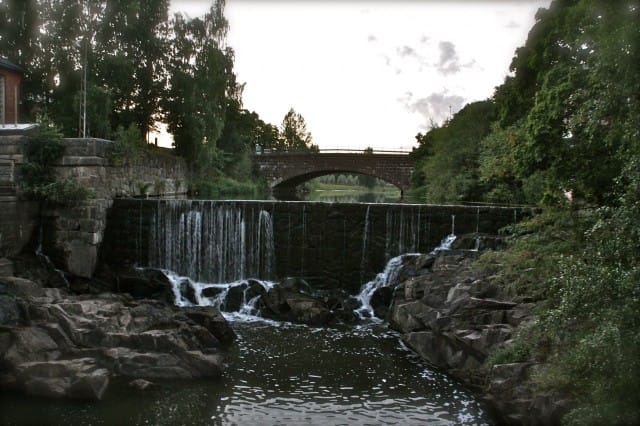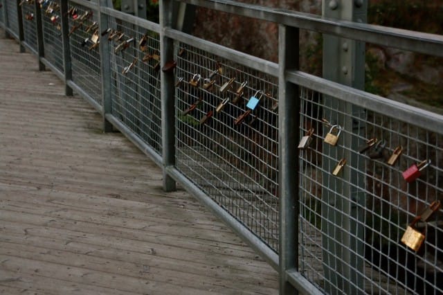 Pian olen alkupisteessä, sillan luona. Käyn vielä katsomassa kuohuavaa koskea ja tutkimassa sen ympäristöä. Koski pauhaa ja ylitän toisen sillan. Siihen on kiinnitetty rakkauslukkoja. Aika romanttista.