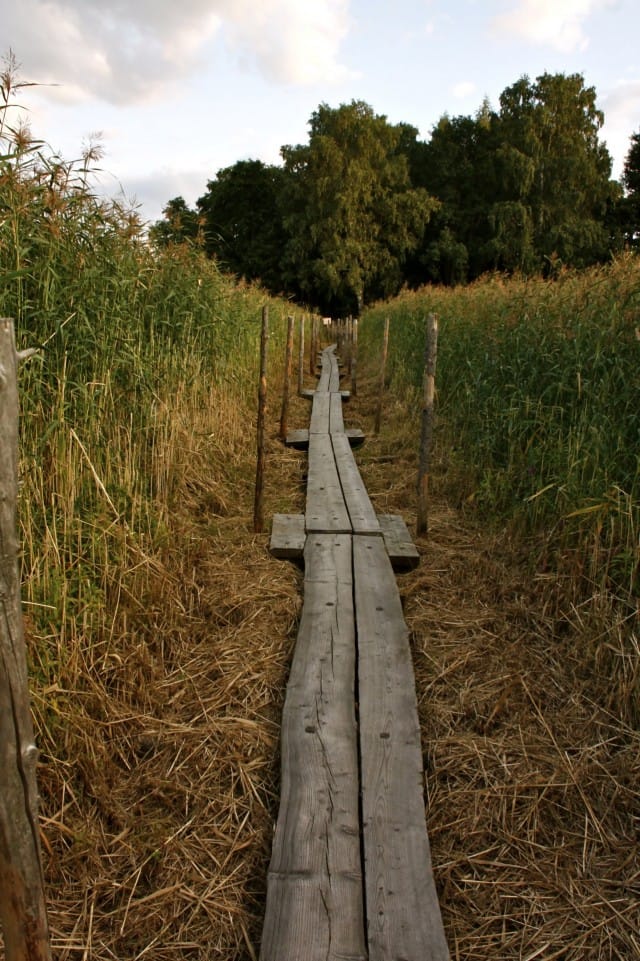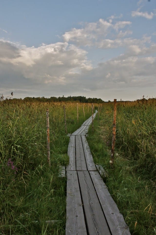 Edessäni on taas pitkospuut. Näiden täytyy olla Kuusiluodon pitkospuut. Jatkan matkaa niitä pitkin, kohti Kuusiluotoa. Aurinko alkaa jo laskea ja maisema on sanoinkuvaamattoman kaunis tällaisessa valossa.