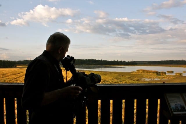 Saavun saarelle. Käännyn vasemmalle, jonne lintutornille ohjaava kyltti osoittaa. Lyhyen matkan jälkeen löydän lintutornin ja kiipeän ylös torniin. Siellä on lisäkseni vain yksi ihminen pitkän kaukoputkensa kanssa, lintubongari. Hän kertoo, että edessäni aukeavaa aluetta on tänään juuri siistitty.