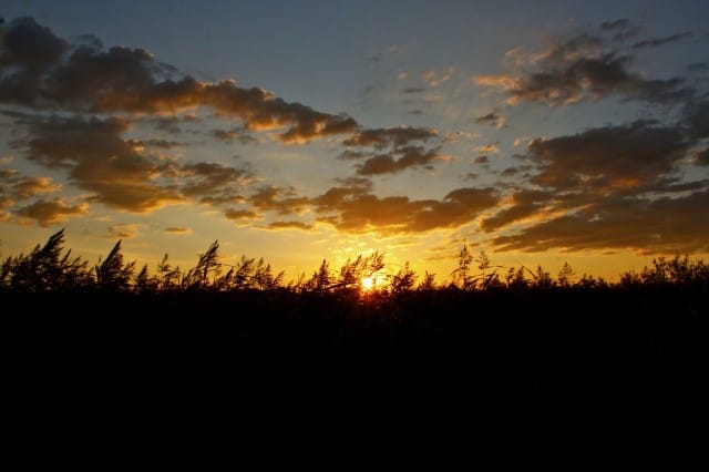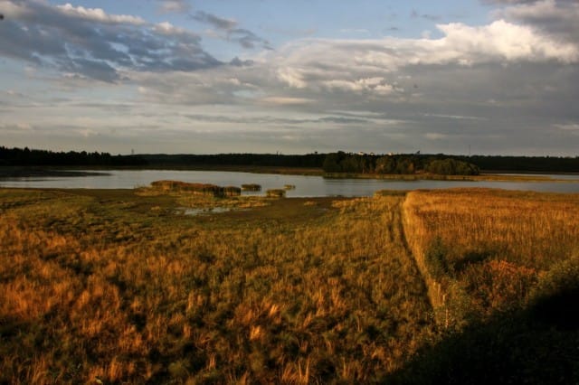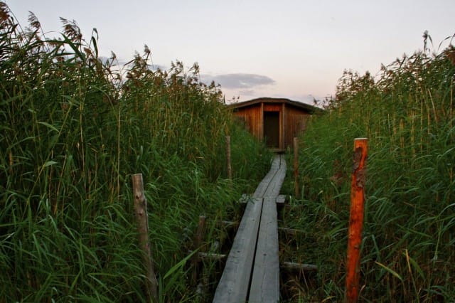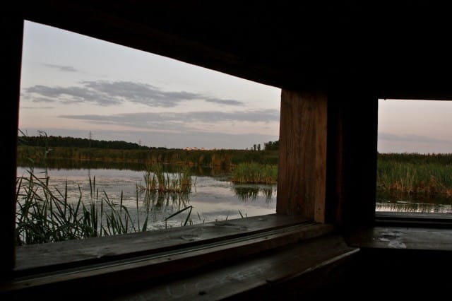 Nyt olen valmis suuntaamaan takaisin, pois saarilta. Kävelen samaa reittiä takaisin ja samalla ihailen edelleen väriään muuttavaa taivasta. Paluumatkalla poikkean vielä reitin varrelta löytyneessä lintubongareiden piilomajassa, joka on todella hiljainen ja rentouttava paikka keskellä kaislikkoa. Kiipeän myös toiseen lintutorniin ja katson vielä maisemaa täältäkin suunnasta.
