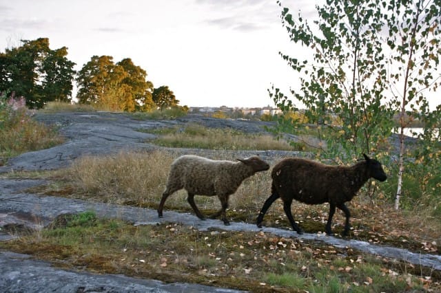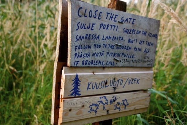 Avaan portin, jossa pyydetään avaamisen jälkeen myös sulkemaan se, etteivät saarella asuvat lampaat karkaa. Täällä ne lampaat siis ovat! Lähden etsimään niitä. Kierrän koko kallioisen Kuusiluodon ympäri. Lampaita ei näy, mutta niiden jätöksiä kyllä. En aio luovuttaa, haluan löytää ne lampaat.