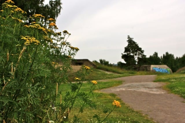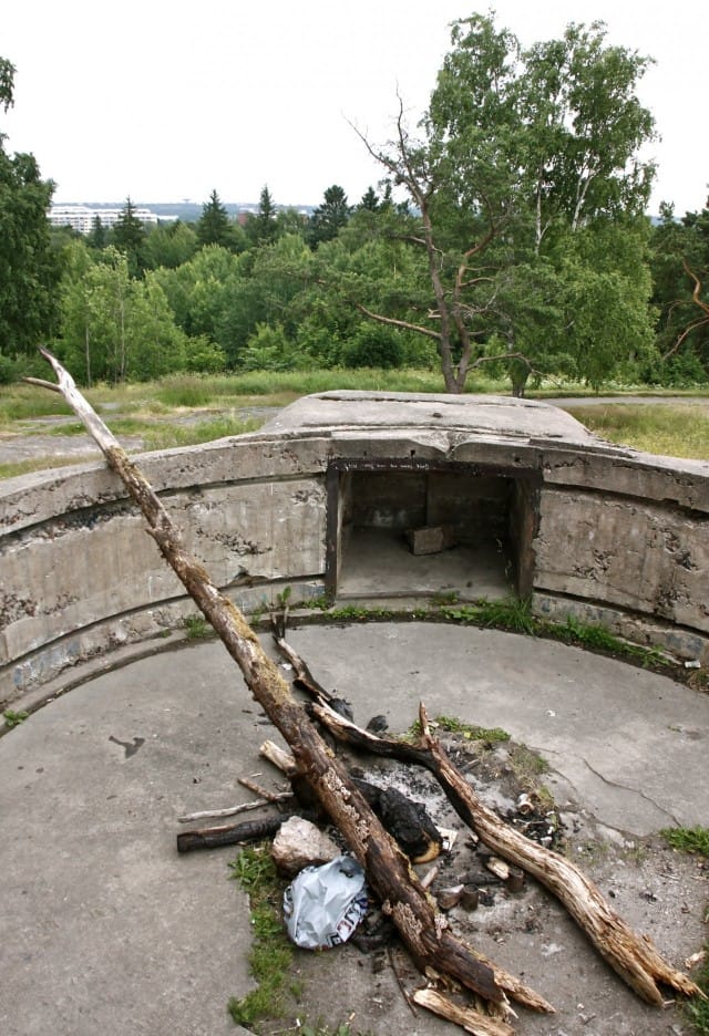 Ympärilläni näkyy sotaan viittaavia esineitä ja kylttejä. Näen useita ilmatorjunta-asemia tykkeineen. Tutkin paikkoja. Alueen keskellä on pieni vesiallas. Maassa on nuotion jäämät. Täällä on näköjään hiljattain grillattu.
