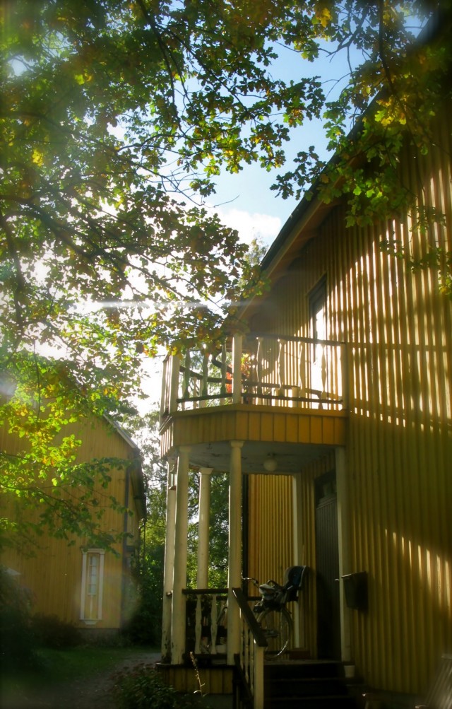 Ilta alkaa hämärtyä ja lukeminen saa riittää. Kävelen takaisin samaa reittiä, koska haluan mennä vielä paluumatkallani tuntemaan puutaloalueen tunnelman. Myös täällä Käpylässä on idyllisiä puutaloja puutarhoineen. Kukkulan päällä näkyy tyylisuunnaltaan funktionalismia edustava Käpylän kirkko. Käppäilen hetken ristiin rastiin puutalojen ympäröimillä kaduilla. Katselen ympärilleni ja vain ihastelen idyllistä Puu-Käpylää ennen raitiovaunupysäkille suuntaamista. Junallakin täältä pääsee takaisin keskustaan, mutta raitiovaunu kaartaa jo pysäkille.