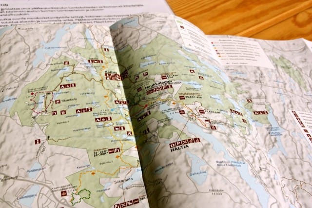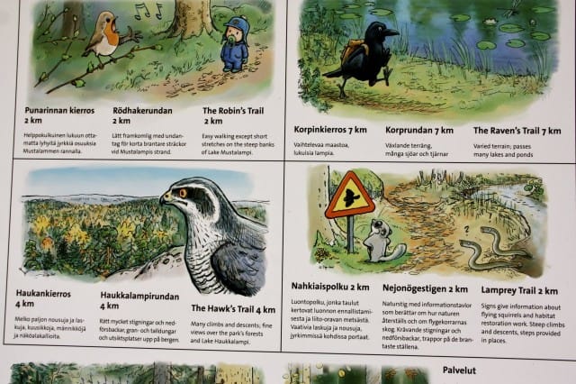Nuuksion kansallispuiston alueella on lukuisia eri reittejä, joista jokainen voi vapaasti räätälöidä omansa. Reitit alkavat heti tien toiselta puolelta ja minä päätän lähteä Haltialta kohti Haukkalampea. Edessä olisi 4,4 kilometrin vaellus Haukkalammelle ja sen jälkeen voisin kierrellä lammen ympäristössä.