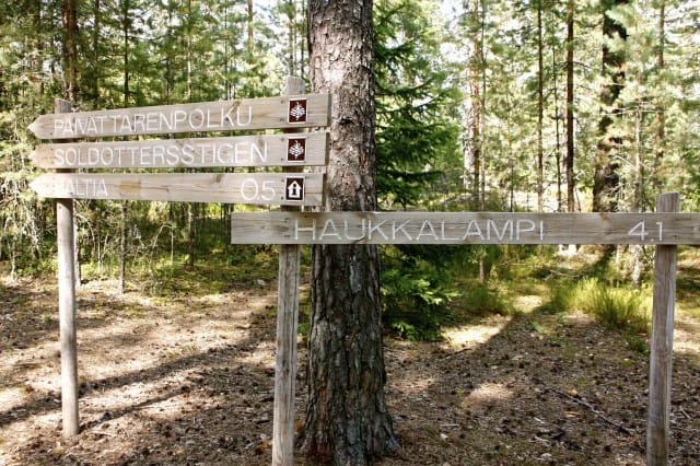 Seuraan Haukkalammen kylttejä. Vastaan tulee vain muutama ihminen. Espanjalaiset turistit kysyvät tietä Haltialle ja bussipysäkille. Ampiainen yrittää liittyä seuraani, mutta karkotan sen kintereiltäni ottamalla muutaman juoksuaskeleen.