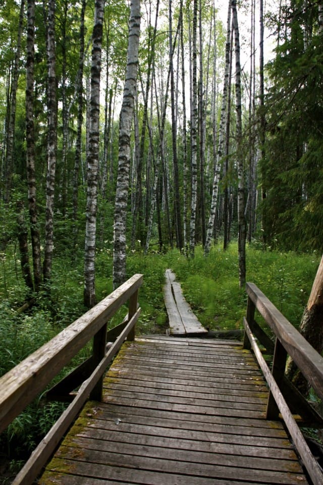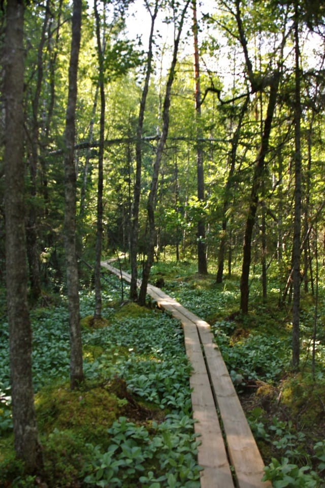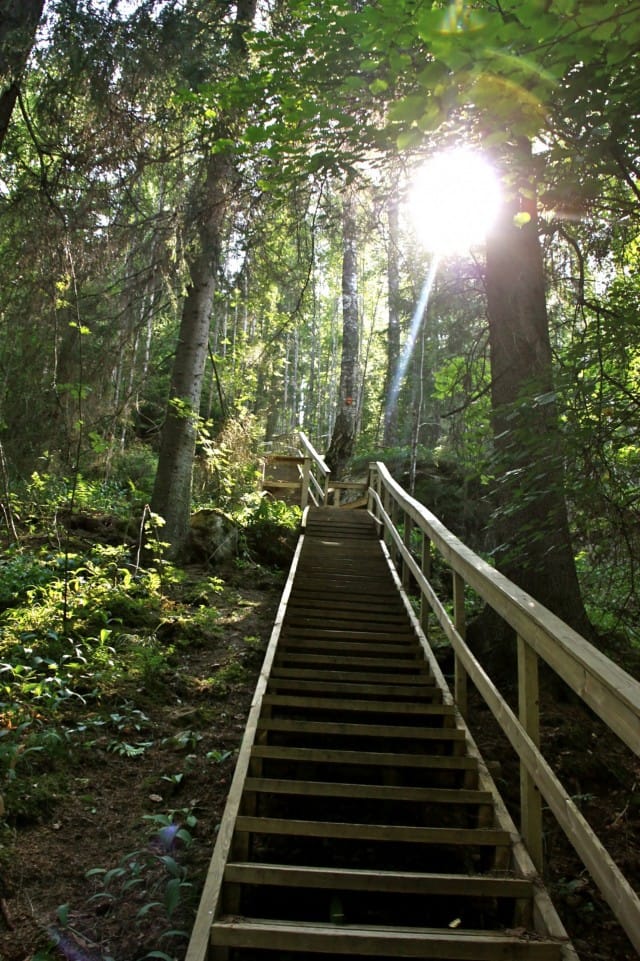 Metsä on hiljainen ja rauhoittava. Ohitan lammen. Metsäkävelyn jälkeen edessä näkyy pitkospuita. Kävelen niitä pitkin ja pian edessä on jyrkkä nousu. Kipuan portaita ylöspäin ja samalla lasken niitä. Yhteensä 314 porrasta, ellen väärin laskenut.