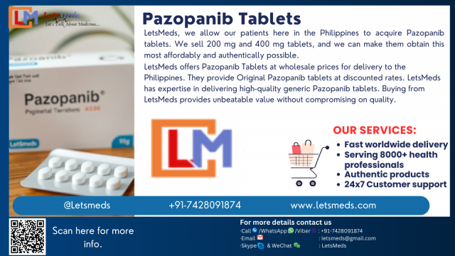 [b]Pazopanib[/b] is already an established medication and is prescribed as a treatment for advanced renal cell carcinoma, kidney cancer, and also some soft tissue sarcomas. At LetsMeds, we allow our patients here in the Philippines and even those here in Metro Manila to acquire Pazopanib tablets. We sell 200 mg and 400 mg tablets, and we can make them obtain this most affordably and authentically possible.