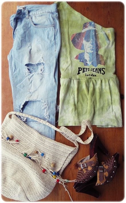 Miehen kulahtanut paita sopii vielä kesän festareille mutta ei sellaisenaan. Tähän ei paljoa tarvita: Sakset ja ompelukone. Leikkaa ensin paita ylhäältä viistosti ja leikkaa hiha pois. Leikkaa helma vyötäröltä pois, säästä helma. Sovita paitaa päälle ja katso miten paljon sivuista otat sisälle. Päärmää kaula-aukko sekä hihansuu. Omele sivusaumat.