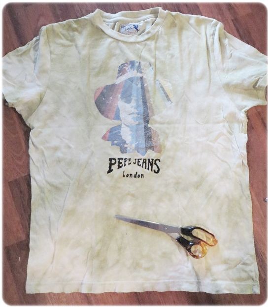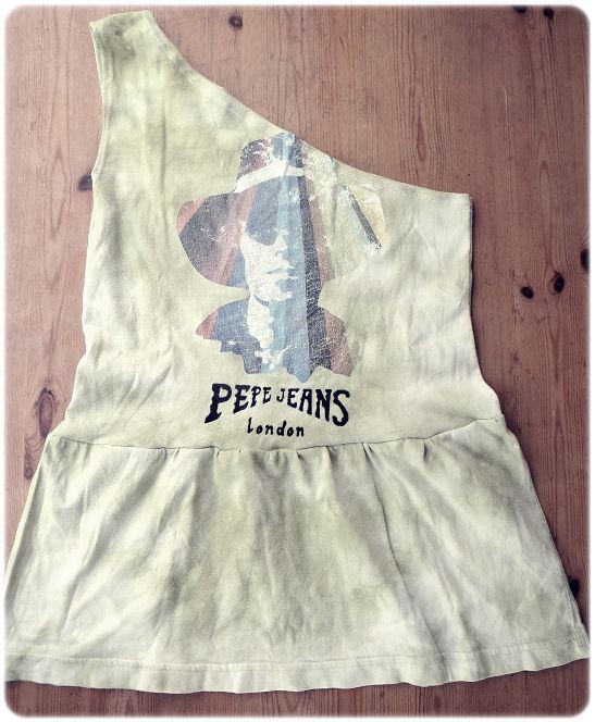 Miehen kulahtanut paita sopii vielä kesän festareille mutta ei sellaisenaan. Tähän ei paljoa tarvita: Sakset ja ompelukone. Leikkaa ensin paita ylhäältä viistosti ja leikkaa hiha pois. Leikkaa helma vyötäröltä pois, säästä helma. Sovita paitaa päälle ja katso miten paljon sivuista otat sisälle. Päärmää kaula-aukko sekä hihansuu. Omele sivusaumat.