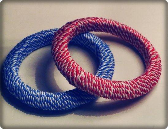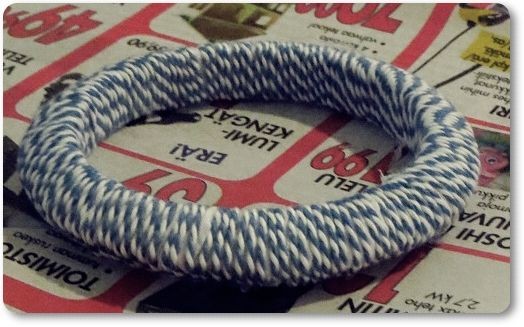 Minulla on tullut tavaksi säästää melkein kaikki. Nämä lasten muovirannerenkaan on juuri sellainen. Helppo tapa mmuuttaa rannerenkaan ulkonäköä. Ensin liimailin silkkinauhan renkaan ympärille (tähän käy mikä tahansa ohut kangaskin) ja sen jälkeen aloin pyörittää narua renkaan ympärille. Käytin kuumaliimaa. Aikaa ei paljoa mene tässä hommassa.