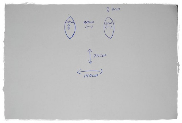 4. Piirrä ovaalinmuotoinen pala (pituus 21cm ja leveys 11cm, merkitse keksikohta).
