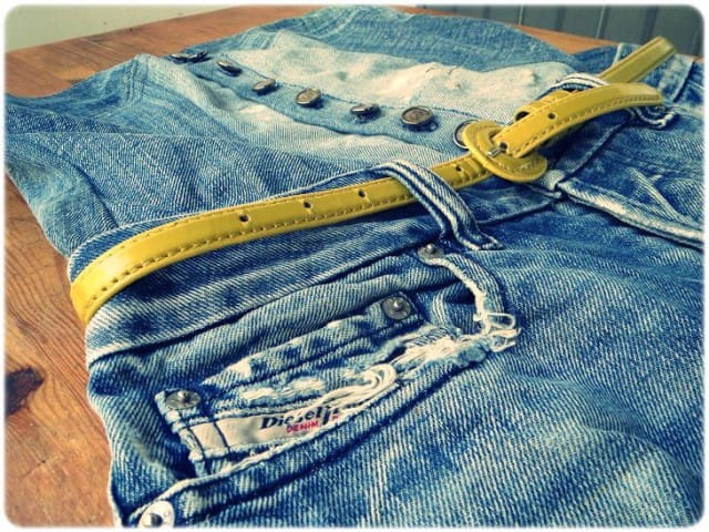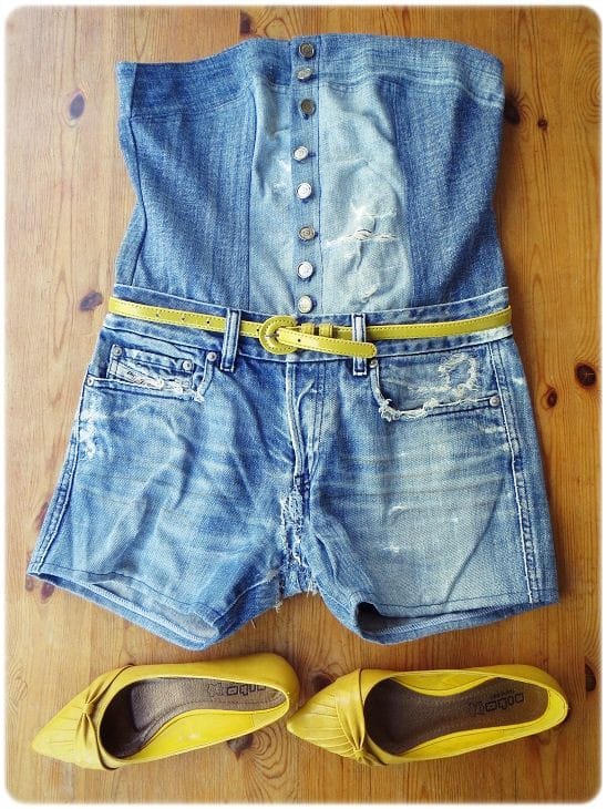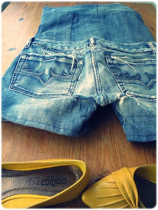 Siksipä kannattaa kaivella lumppulaatikkoa ja tehdä löytöjä ihan omasta kaapista. Tänään miehen vanhat farkut muuttuivat hellepäivän shortsiasuksi.
