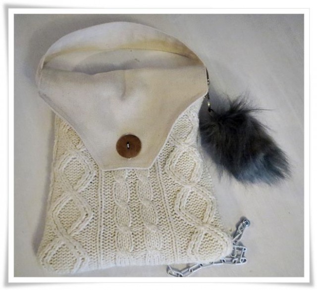 Otin lumppulaatikostani jämäkankaan josta leikkasin vuoren, läpän sekä lyhyen kantoosan. Nappi löytyi myös lumppulaatikon pohjalta. Näillä sain tehtyä kivasti pikkuisen laukun. Lumppulaatikkoa kun kaivelin niin löysin pienen palan tekoturkista josta laukku sai pienen koristeen.