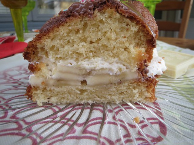 Anna kakun jaahtyä rauhassa. Kaada kakku vuoasta pois ja leikkaa kakku puoliksi. Paloittele alemman kakun päälle banaania ja niiden päälle kaada kinuskia. Vatkaa kerma vaahdoksi ja laita kermavaahtoa banaanien ja kinuskin päälle. Aseta kansi päälle.