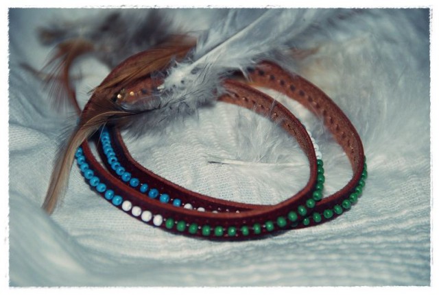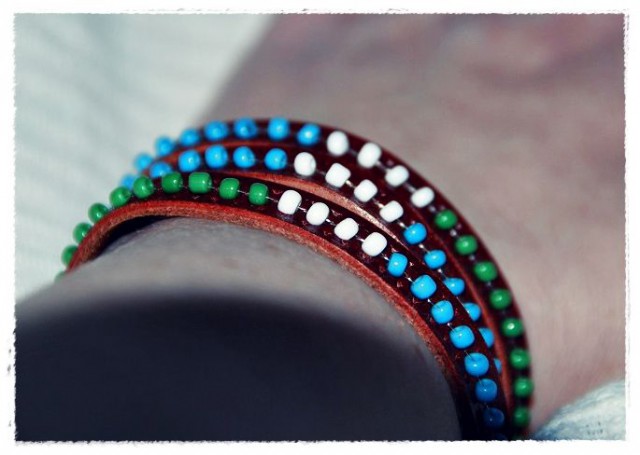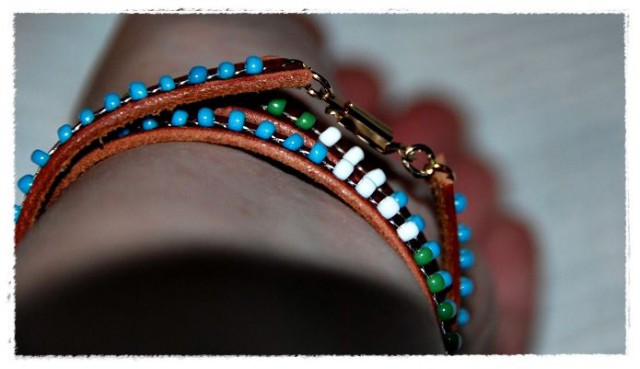 Ensin katkaisen vyön turhat osat, lyön vyön molempiin päihin reiän ja pujotan korukiinnittimen. Muuta ei tarvita kuin ranne.