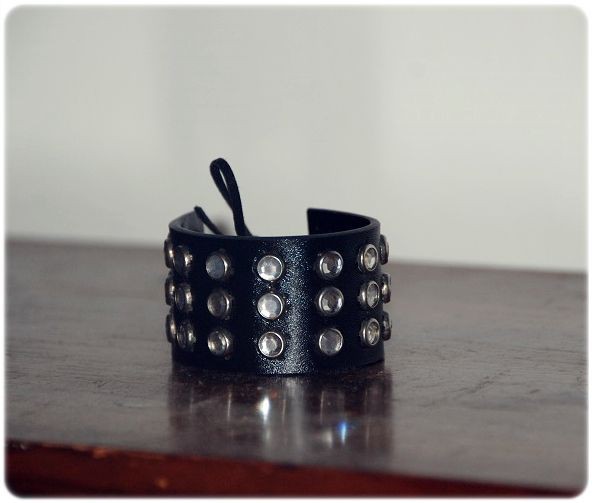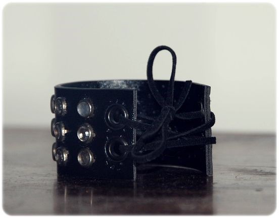 Leikkaa vyöstä ranteen mittainen pala ja tee neljä reikää molempiin päihin. Pujota nahkanauha. Valmis.