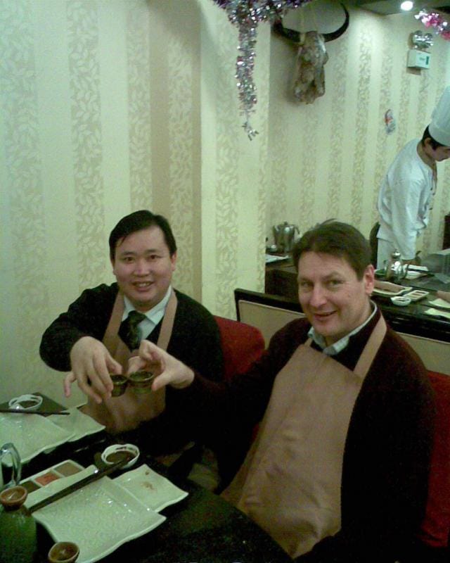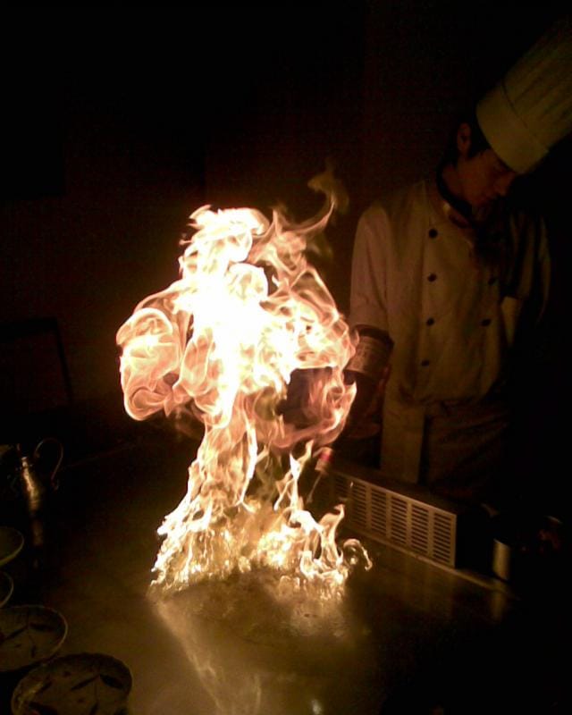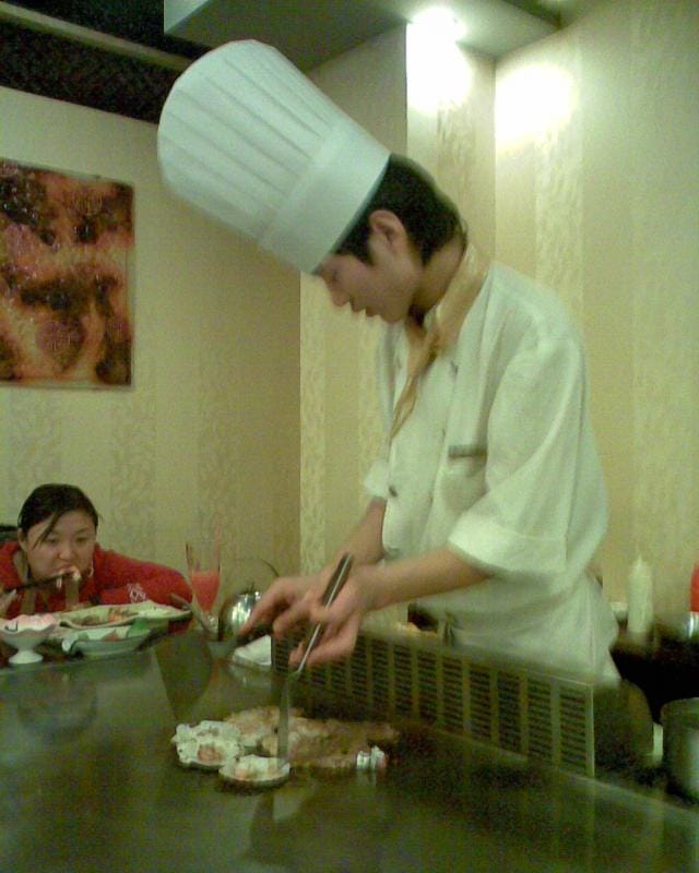 Ensiksi menimme läheiseen Teppanyaki –ravintolaan illalliselle, vaikka vatsassa ei juuri ollut vapaata tilaa lounaan jäljiltä. Näissä tämän tyyppisissä ravintoloissa istutaan porukalla valtavan paistolevyn ympärillä ja kokki paistelee kaikenlaista juuri sinulle ja kavereillesi silmiesi edessä. Voit vapaasti valita vaikka mitä ja kuinka paljon tahansa – jättikatkarapuja ja herra ties mitä muita klimppejä ja lonkeroita, vaikkapa flambeerattua kampasimpukkaa, jos sitä sattuu mieli tekemään, kalaa monta eri lajia, vihanneksia, tofua, lihaa, kaljaa ja sakea saa kitata mielin määrin ja hinta on aina se vakio eli 150 rämpylää eli 15 euroa. Ja joka sakemukillinen aloitetaan kiekaisemalla reippaasti että “Gambei!” eli pohjanmaan kautta.