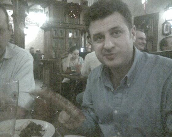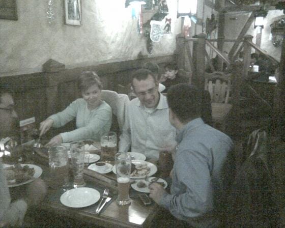 Tilasin alkupalaksi guljashin, unkarilaisen keiton, mikä oli aivan äärimmäisen hyvää, hinta 6 euroa. Soosi oli paksua, mausteista ja punaista, joukossa erittäin pehmeitä lihakuutioita ja perunaa yms, kyytipojaksi vehnäolutta tuopillinen. Alexei otti pääruuaksi possua, mutta me muut tilasimme neljään pekkaan metrin makkaraa lisukkeineen eli ranskiksia ja hapankaalia, ja tietysti 50 grammaa hrenovuhaa.