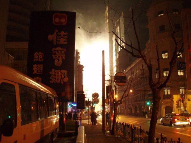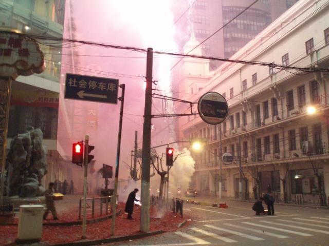 Uutta vuotta (7.2.) läksimme viettämään erääseen paikalliseen viiden tähden hotelliin kaupungin keskustassa. Olimme varanneet huoneet hotellin 17. kerroksesta, mistä oli oivalliset näkymät Nanking Roadille ja osaksi Bundiinkin. Aattoiltapäivä menikin mukavasti lähes tyhjän hotellin kuntosalilla ja kylpyläosastolla naatiskellessa ja illan ilotulituksia odotellessa, joihin kaupunkilaiset olivat pikku hiljaa virittäytyneet jo usean viikon ajan paukuttelemalla harvakseltaan milloin missäkin ja lähes mihin vuorokauden aikaan tahansa.