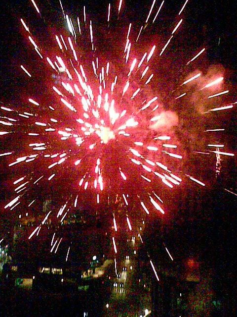 Keskiyön koittaessa pauke oli katkeamaton ja kadut täynnä savua. Meteli oli korvia huumaavaa. Täällä kun ei juuri myydä semmoisia puolen litran maitopurnukan kokoisia “Karjala takaisin ja heti” –patoja kuin Suomessa, vaan standardikoko näyttää olevan sellainen 12 pullon viinilaatikon kokoinen pata, missä tulivoimaa riittää kotitarpeiksi. Rivi patoja vaan keskelle tietä ja stidiä perään. Muutamat taksit koittavat silti päästä eteenpäin savun ja paukkeen keskellä ja väistellä vihaisimmin räiskyviä laatikoita.