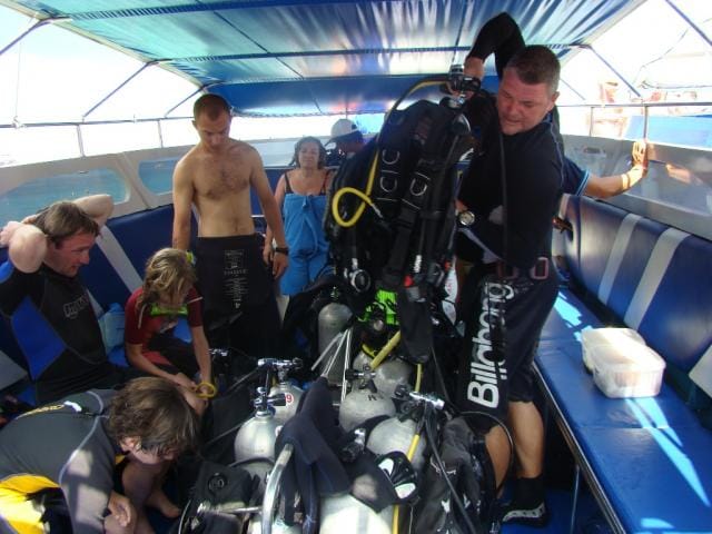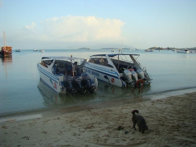 Pinnan allehan oli tietysti myös päästävä ja niinpä sitten keskiviikkoaamuna liityimme muutaman ranskalaisen, britin, venäläisen ja kiinalaisen seurassa Koh Taon saarelle menevään retkikuntaan eli siis yhteen niistä varmaankin lähes kymmenestä muusta veneestä, sukellusretkitarjontaa kun täällä tosiaan on vaikka joka mutkassa. Aamuseiskalta meidät noudettiin hotellilta ja kasilta pääsimme jo starttaamaan satamasta. Kolmen 225 hevosvoiman perätuupparin vauhdittamana matka Koh Taon saarelle ei ottanut meiltä puoltatoista tuntia enempää ja pinnan alle päästiin jo ennen yhtätoista.