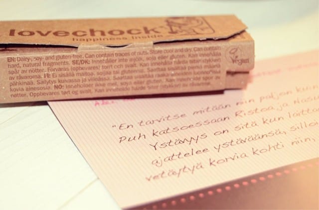 [b]MIELITEKO: YSTÄVÄT[/b] Tänään mun ovesta tuli sisään ihania asioita, ystävänpäiväkortti aivan ihanin sanoin ja rakas ystävä joka toi terkkuja PR-toimistosta. Just sellaisia terkkuja, jotka on tie suoraan mun sydämeen. Raakasuklaata…