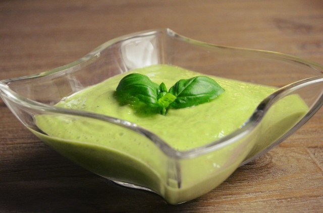 Pilko kurkku palasiksi. Kuori ja lohko sipuli. Poista avokadosta siemen ja kuori. Laita avokado, kurkku ja sipuli blenderiin. Purista limetin mehu sekaan. Lisää basilikanlehdet. Anna koneen käydä, kunnes seos on tasaista. Lisää lopuksi öljy, suola, spirulina ja cayennenpippuri.