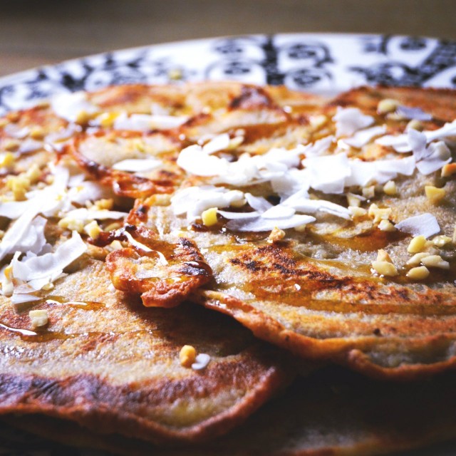 Itse heitin valmiit letut lautaselle, aina yhden letun päälle agavesiirappia, kookoslastuja, hasselpähkinärouhetta ja seuraava pannari päälle. Aiaiai.