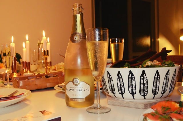 Hommaksi jäi tuoda paikalle kuohuvat ja minähän toin. Olin samaisella viikolla juhlimassa Castellblanc Cavan uutta etikettiä ja kotiinviemisiksi sain pullon uudella tyylikkäällä ilmeellä varustettua Cavaa. Pistetään hyvä kiertämään eli Cavaa juhlapöytään. Cavahan käy kaiken kanssa, aamiaisen, lounaan, jälkiruoan, [i]no limits[/i].