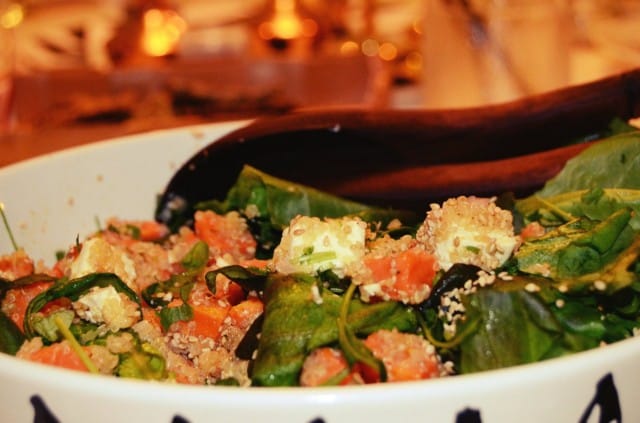 Tottakai tästä vierailuviikonlopusta seurasi "[i]writer’s block[/i]" ,ei mitään kirjoitettavaa. Meillä oli perjantaina kuitenkin niin erinomaiset tarjoilut, että piti jälkikäteen juhlien emännältä ruinata herkullisen salaatin ohje. Olkaa niin hyvät, arvon lukijat.