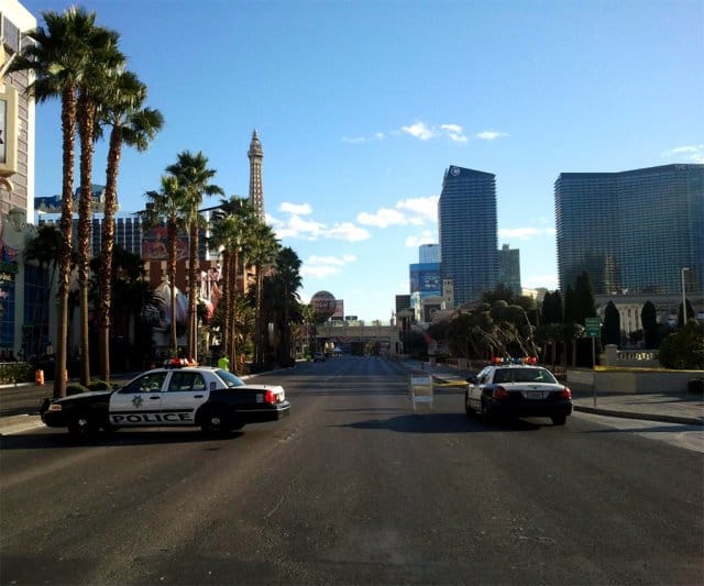 En tiedä, aukeneeko tämä kuva niille, jotka eivät ole Vegasissa tai ylipäätään jenkkiläisissä suurkaupungeissa käyneet. Otos on joka tapauksessa aivan The Stripin eli pääkadun keskeisimmältä kohdalta, Caesar’s Palacen sisäänkäynnin edestä. Kyseisessä kohdassa on vuorokaudenajasta riippumatta loputon autojen ja turistien meri. Tänään herätessäni paikalla oli aavemaisen hiljaista. Koko katu oli suljettu. Caesar’s Palaceen oli mahdotonta päästä. Koko Bellagion edusta kiinni, suihkulähdeshow loisti poissaolollaan. Bally’s eristetty teipillä joka ilmansuunnasta. Samoin Bill’s Gambling Hall ja muutama muu keskeinen kasino. Vegasin ruuhkaisimman risteyksen keskellä makasi pari karrelle palanutta autonromua. Poliiseja kaikkialla, kokonaisia kortteleita eristetty keltaisella nauhalla. Ei ihmisiä, vain makoilevia ruumispusseja ja pahaenteisen vaitonaisia poliiseja. Yritin kysyä yhdeltä, että mitä täällä oikein tapahtuu. Sain vastaukseksi informatiivisen ”this is a crime scene”. Kas, en tajunnutkaan.