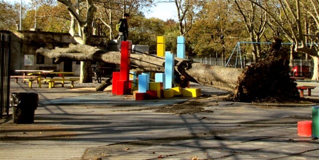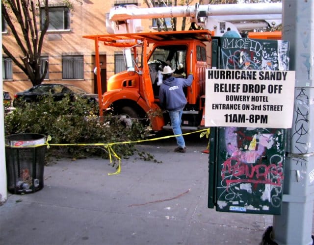 Olen viettänyt New Yorkissa elämästäni niin vähän aikaa, että minulla ei ole mitään vaistoja Manhattanilla liikkumisen suhteen. Toisaalta en ole varsinaisesti myöskään menossa mihinkään, joten kävelen katuja umpimähkään. Seuraavien tuntien aikana näen Sandyn pahoin runteleman Battery Parkin aivan Manhattanin eteläkärjessä, WTC:n raunioiden päälle kovaa vauhtia nousemassa olevan Freedom Towerin, kaduilla ruoanjakelupisteisiin odottavia ihmisiä ja paljon myrskyn takia suljettuja kauppoja. Sää itse asiassa on mitä mainioin, liekö kuuluisa myrskyn jälkeen-efekti, mutta sähköt ovat poikki vielä suuresta osasta Manhattania. Vietän pääosan ajasta Manhattanin eteläosassa, eli kaikkein pahiten kärsineellä aluella. Kaupunki vaikuttaa kuitenkin saaneen itsensä jaloilleen jo parissa päivässä, eikä turisti välttämättä huomaa hurrikaanin tuhoja muusta kuin siellä täällä lojuvista katkenneista puista ja tulvimista estävistä hiekkasäkeistä.
