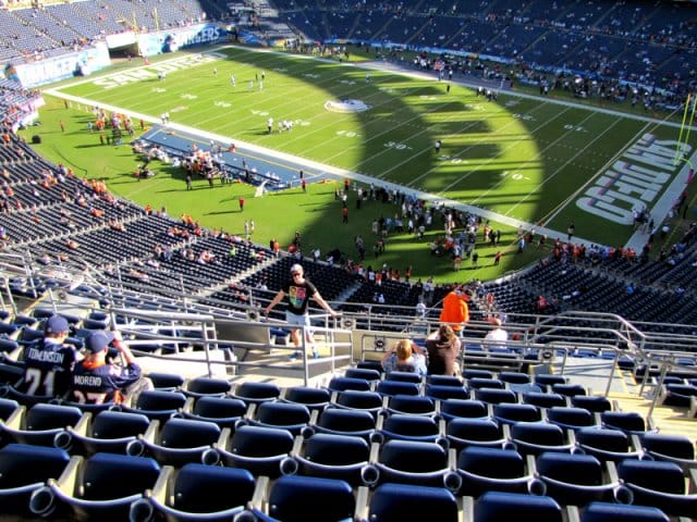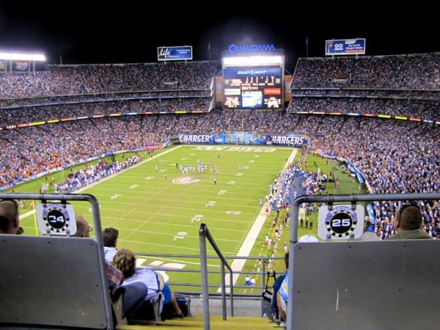 Aterian jälkeen on aika suunnata kohti Qualcomm Stadiumia. Se löytyy navigaattorin avulla helposti. Kello on kaksi iltapäivällä, kun matsi alkaa kuudelta. Lähin parkkipaikka löytyy kahden kilometrin päästä, sillä stadionia ympäröivät tuhannet parkkiruudut on parkkeerattu täyteen jo ajat sitten. Monday night football on niin käsittämättömän iso juttu, ettei sitä voi edes tajuta.