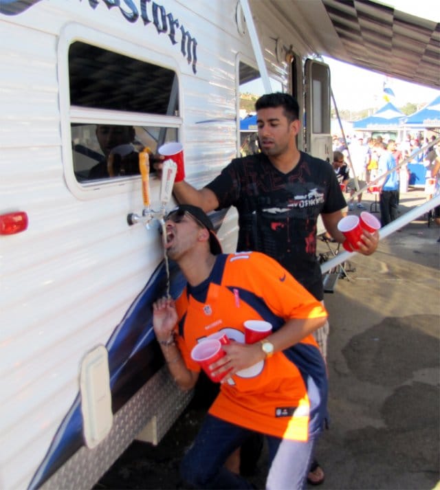 Kävelemme asuntovaunun ohi, jonka seinään on asennettu kaljahana. Broncosin paitaan pukeutunut mies vaikuttaa ylpeältä tekeleestään ja juo suoraan hanasta.