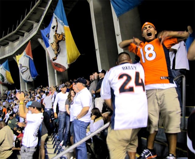 Ottelussa nähdään myös täysin käsittämätön sulaminen kotijoukkueelta. Peli on tauolla 28-0 isännille. Jotenkin Broncos kuitenkin onnistuu voittamaan ottelun 28-38. Kaukaa Denveristä matkanneet oranssipaitafanit ottavat kaiken irti loppusekuntien ratkaisusta. Stadion räjähtää ratkaisevasta touchdownista. Chargers-fanit viheltävät, Broncos-fanit huutavat täyttä kurkkua. Silti ketään ei vieläkään nähdäkseni satu. En pysty olemaan hymyilemättä. Tämä on hienoin urheilujuhla, mitä olen koskaan paikan päällä todistanut.