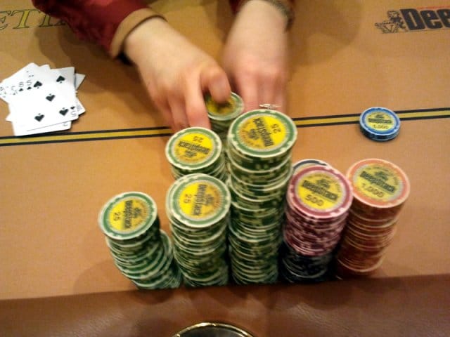 Saavun Venetianiin ajoissa rekisteröityäkseni turnaukseen – Vegasin turnaukset sallivat myöhäisen rekisteröinnin 2-3 tuntia alkamisajan jälkeen, jolloin pelaaja tosin saa rangaistukseksi vähemmän merkkejä – mutta lounasta en ehdi syödä. Myös aamupala jäi väliin. Näläntunne katoaa kuitenkin välittömästi, kun vihdoin pääsen pokeripöytään. Tunne on euforinen. Taas täällä, merkkipino edessä pokerinpelaajien taivaassa. Edessä lukemattomia tunteja kaikkea sitä, mitä pokerissa eniten rakastan. Vihdoinkin.