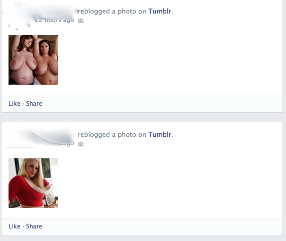 Pornoa ja erotiikkaa löytyy somesta kaikkialta, Instagramista, Tumblrista, Pinterestistä, kuvafoorumeista ja niin edelleen. Ongelmaksi muodostuu kuitenkin se, että melkein jokaiseen yhdistetään lähes pakosta Facebook. Esimerkiksi yllä näkyvässä kuvassa[url=http://www.tumblr.com/docs/en/facebook] Tumblr on yhdistetty Facebook-tiliin[/url], ja kertoo aikajanalla Tumblr-jaoista. Jos käytät Tumblria pornovarastona, kannattaa harkita tilin pitämistä erillään Facebookista. Myös Instagram-tykkäyksesi jaetaan Facebookiin, jos et muuta [url=http://help.instagram.com/536741816349927]asetusta[/url] "Share Settings", "Facebook", "Share Likes to Timeline."