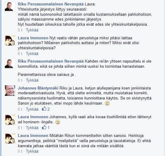 Facebookin bannikäytäntö on tuttu esimerkiksi Jussi Halla-Ahon kootut sanansa syömiset ja [url=https://www.facebook.com/pages/Paljastettu-3/609115989129949]Paljastettu[/url]-sarjan sivuille, jotka ovat muutaman vuoden ajan julkaisseet ruutukaappauksia enimmäkseen perussuomalaisten ja muutoslaisten poliitikkojen natsisävyisistä sanomisista. Sivuja on suljettu ja perustettu uudelleen lukuisia kertoja, joten heillä on nykyisin Facebookista riippumaton sivusto [url=http://www.paljastettu.fi/]paljastettu.fi[/url].