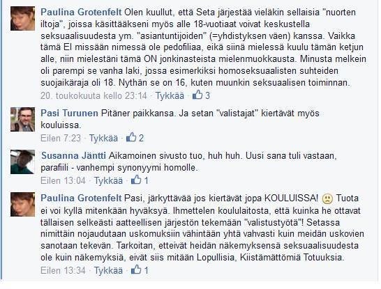 Kauhistus, SETA järjestää nuorten iltoja. Näin [url=https://www.facebook.com/vastustamme/photos/a.291700760999529.1073741827.291523694350569/297973577038914/]pedofiilit leipovat epävarmoista nuorista täyshomoja[/url]. Irti SETAn otteesta!