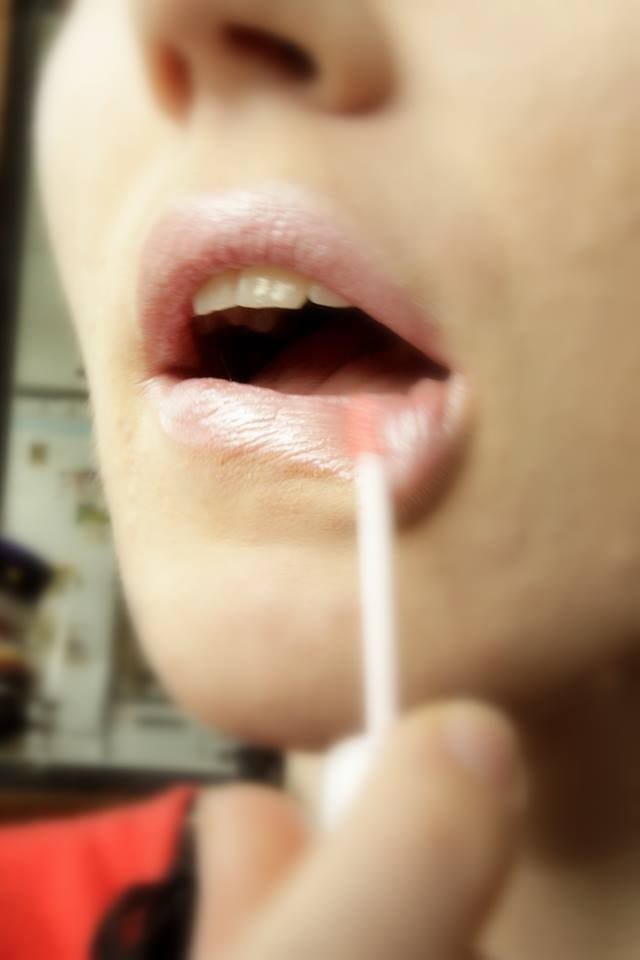 Seuraavaksi kokeilimme huulia pullistavaa huulikiiltoa. SH on saanut tämän joskus muinoin äidiltämme. Kiilto taisi olla jonkin venäläisen halpismeikkiketjun tuote. Huomatkaa upea, tyyliin sopiva väri!