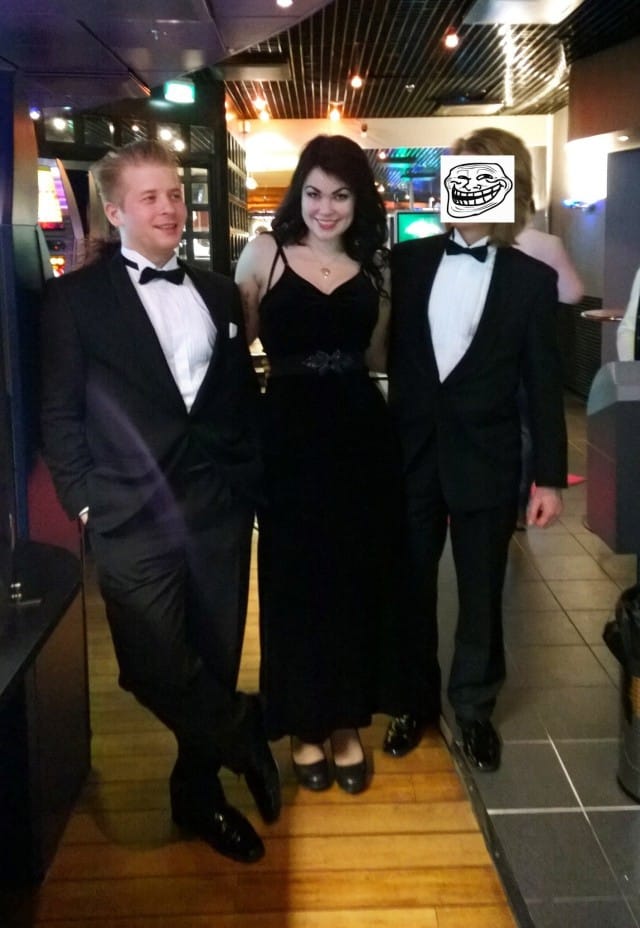 Lopulta päädyimme kasinolle uhkapelaamaan, ja olihan minun pakko saada sieltä pari yhteiskuvaa päivänsankareiden kanssa. Minua oikein harmittaa, että jouduin peittämään HM:n naaman! Hän oli niin komea. Miesten pitäisi aina käyttää smokkia.