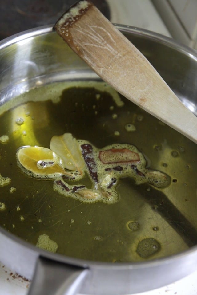 1. Aloita kuumentamalla öljyä. Lisää öljyyn muutama kokonainen kardemumma, neilikka, kanelitanko ja laakerinlehti. Paistele näitä muutama minuutti sellaisella lämmöllä, että öljy hieman kuplii mutta ei syty palamaan. Se olisi huono juttu.