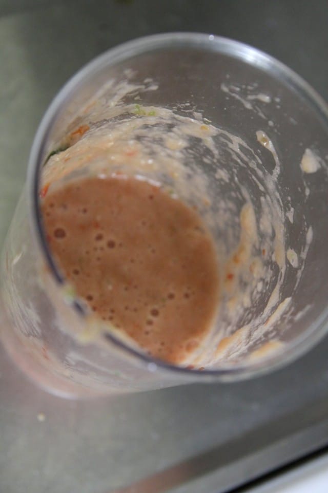 2. Surruta 2 tomaattia ja kaksi (puna)sipulia tällaiseksi mössöksi sauvasekottimella. Pilko paloiksi vielä 2 tomaattia.