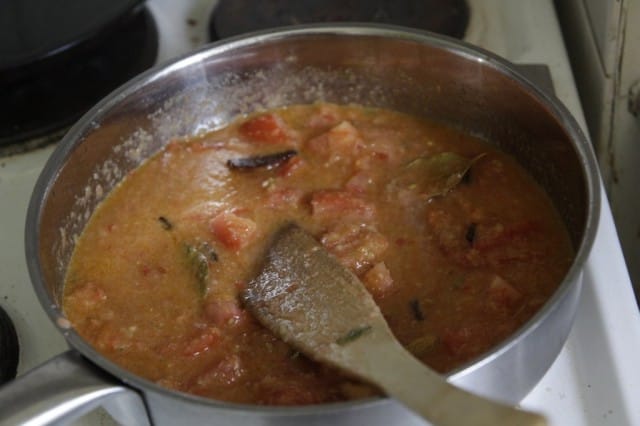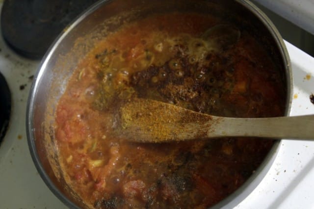 3. Lisää tomaatit ja tomaattisipulimössö öljyyn ja varo räiskeitä. Voit nyppiä mausteet pois jos haluat, mutta minä en yleensä nypi.