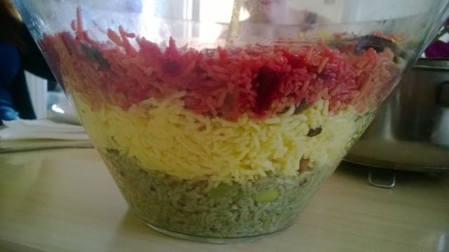 Ihan älytöntä! Jokainen riisikerros on värjätty luonnollisesti: punainen punajuurella, keltainen porkkanalla ja vihreä korianterilla. Jokaisessa kerroksessa oli myös oma makunsa. Nam nam, tulee oikein nälkä kun katselee tätä kuvaa...Voisinkin mennä syömään!