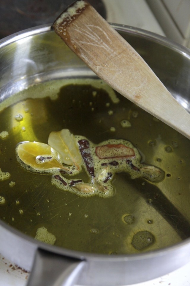 [b]1.[/b] Aloita kuumentamalla öljyä. Lisää öljyyn muutama kokonainen kardemumma, neilikka, kanelitanko ja laakerinlehti. Paistele näitä muutama minuutti sellaisella lämmöllä, että öljy hieman kuplii mutta ei syty palamaan. Se olisi huono juttu.